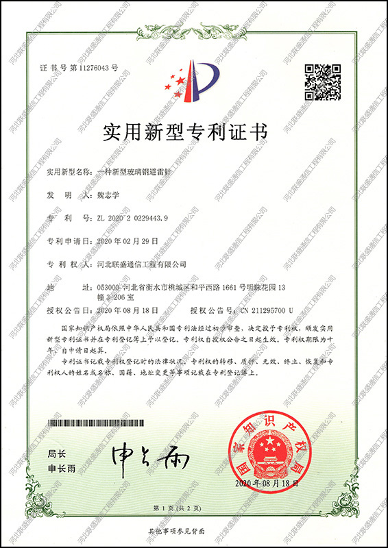玻璃鋼避雷針實(shí)用新型專利證書